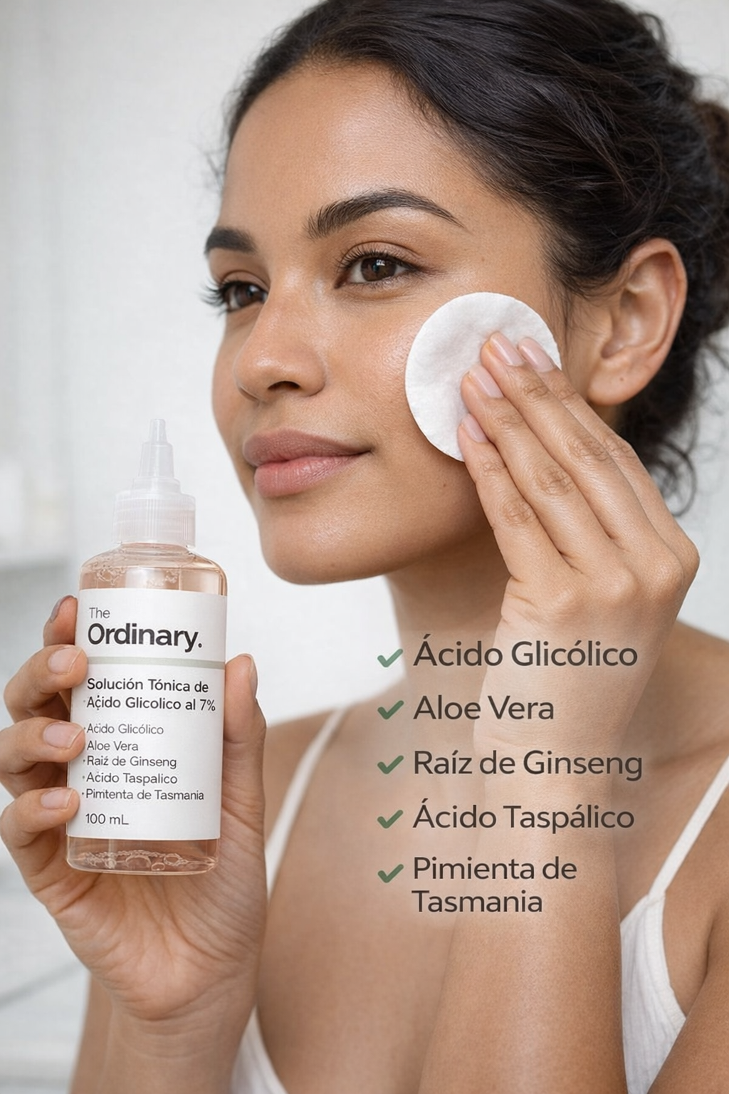 • Ácido Glicólico (7%): El AHA más potente que elimina células muertas, limpia poros y suaviza arrugas finas.